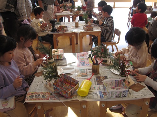自然環境学習事業の一環として、NPO法人美しいやまがた森林活動支援センターの5名の講師の先生をお招きし、木工クラフトで門松作りに取り組みました。門松の由来を教えていただきながら、木の実を選んだり組み合わせたりと、楽しんで制作するお友だち!木の実を選ぶ目はキラキラと輝き、一人ひとり素敵な門松が出来上がりました。