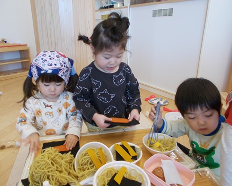 りすくみではおままごと遊びが流行っています。フェルトを海苔やごはん、毛糸を麺に見立ててイメージを膨らませながらお料理を作って楽しんでいるお友だち!!