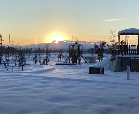 澄んだ空気の中、園庭から眺める新年の夕日がとても美しく、穏やかな一年の始まりを感じさせてくれます。