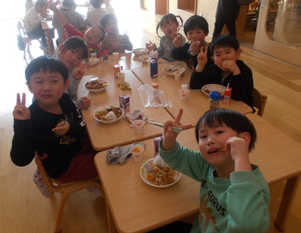 3.4.5歳児のお友達が遊戯室に集まりみんなで一緒に食べました。「おいしいー」という声があちこちから聞こえ何度もおかわりをするお友達の姿も。