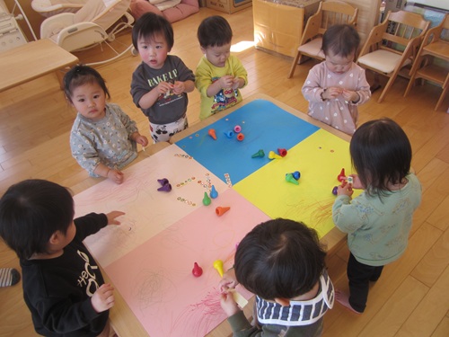 大きな紙にシール貼りやお絵描きをして楽しみました。