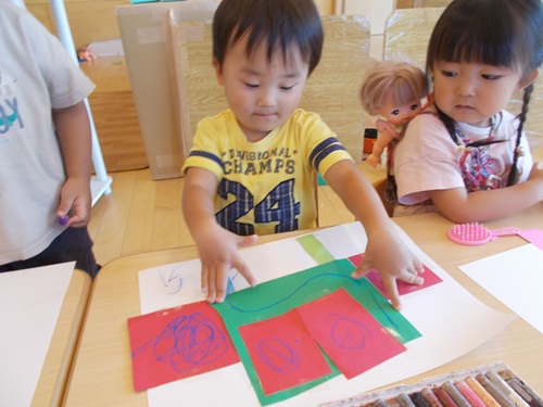 画用紙の切れ端を使って、並べていくうちに車みたいに見えることに気づいたお友だち。窓をつけたりタイヤを描いたりしながらイメージを膨らませお友だちや先生に説明してくれました。素敵な発見だね!