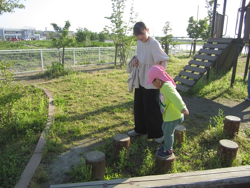 「お外に行くよ〜」と声をかけると「やったー!」とウッドデッキへ一目散!!ひなたぼっこをしたり、かけっこをしたり、思いっきり体を動かして朝からパワフルな2歳児さんです。