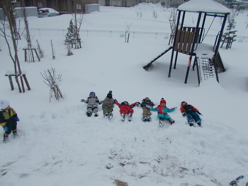 園庭に積もった雪を見る子ども達の目はキラキラと輝いています。