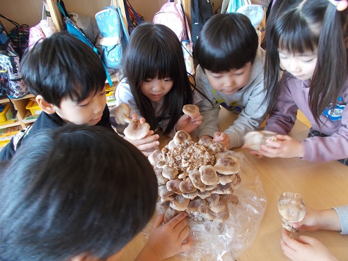 今年も自然環境学習事業の一環で南陽市農林課さんより「きのこ栽培キット」をいただき、きのこ栽培を始めました。ぞう組のクラスではしいたけとなめこを栽培中です。毎日お水をやったり、大きくなるのを楽しみにしています!!しいたけは1回収穫することができ給食の先生から調理してもらいおいしくいただきました!自分たちが育てたしいたけの味は格別だったようです。なめこの収穫も楽しみにしている年長さんです。
