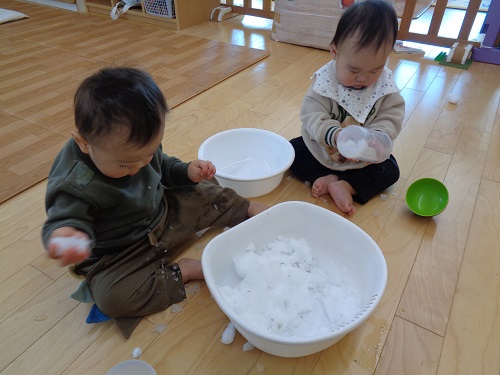 園庭に積もった雪をお部屋の中に持ってきて雪あそびを楽しみました!最初は冷たい雪を前にじーと見ていたお友だちもいましたが先生が雪に触れている姿を見て、お友だちも雪に触れてみたり、カップに雪を入れたりして、雪の感触を室内で思いっきり楽しんだひよこ組さんです。