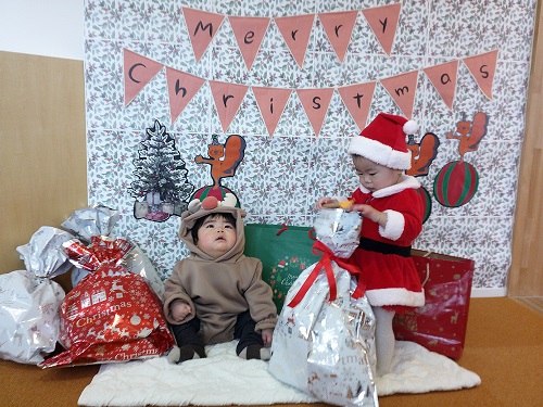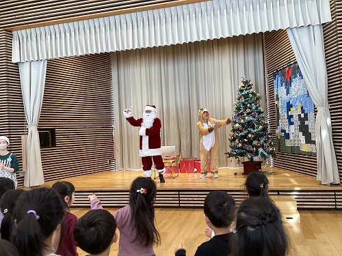 クリスマスイブ。保育園にサンタさんが来てくれました!!朝から「今日、サンタさん来てくれるかな〜?」とワクワク、ドキドキしていた子ども達。あわてんぼうのサンタクロースのお歌を歌い終わると、シャンシャンシャンと鈴の音が…。「サンタさんだ〜!」と大きな歓声があがりました。3.4.5歳児のお友だち、一人ひとりがサンタさんよりプレセントをいただきました。最後は赤鼻のトナカイの曲に合わせてサンタさん、トナカイと一緒に踊り、楽しい時間を過ごしました☆